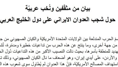 بيان من مثقّفين ونُخب عربيّة حول شجب العدوان الايراني على دول الخليج العربي في خضمّ الحرب المندلعة بين الولايات المتحدة…