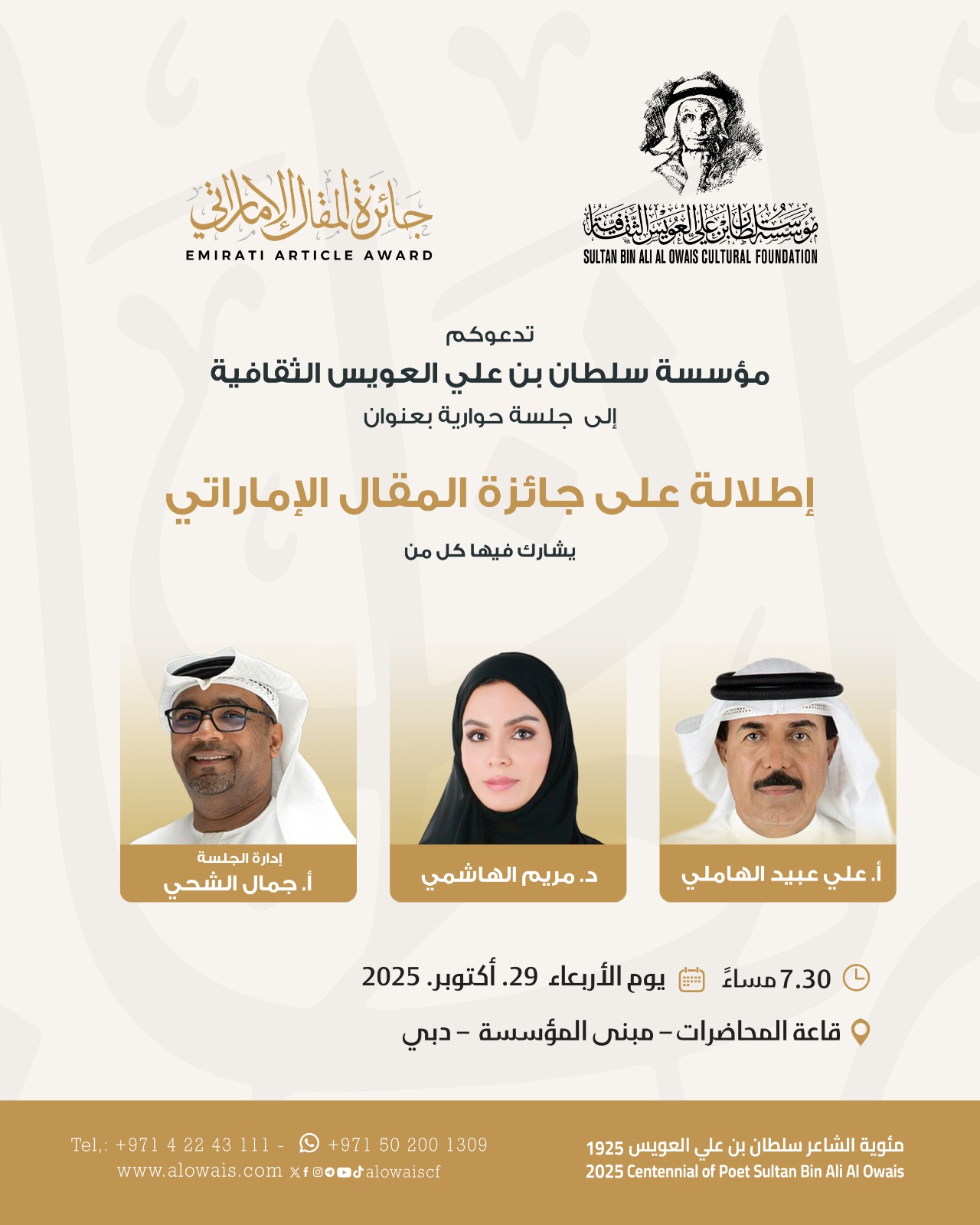 مؤسسة سلطان بن علي العويس الثقافية: إطلالة على جائزة المقال الإماراتي(جلسة حوارية وقراءة نقدية)