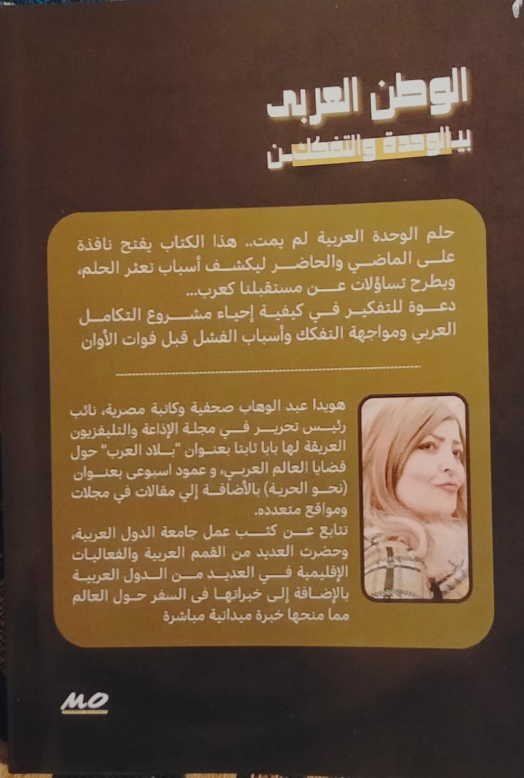 صدر حديثًا للكاتبة والصحفية هويدا عبد الوهاب، نائب رئيس تحرير في مجلة الإذاعة والتليفزيون المصرية ورئيسة مكتب مجلتنا كل العرب فى القاهرة، كتابها (الوطن العربي… بين الوحدة والتفكك) : قراءة في فشل مشروع التكامل ودور جامعة الدول العربية )، الذي يتناول أهم القضايا المعاصرة التي تعيق التكامل العربي ويكشف عن أسباب التفكك والضعف الحالي في مسيرة الوحدة بين الدول العربية.