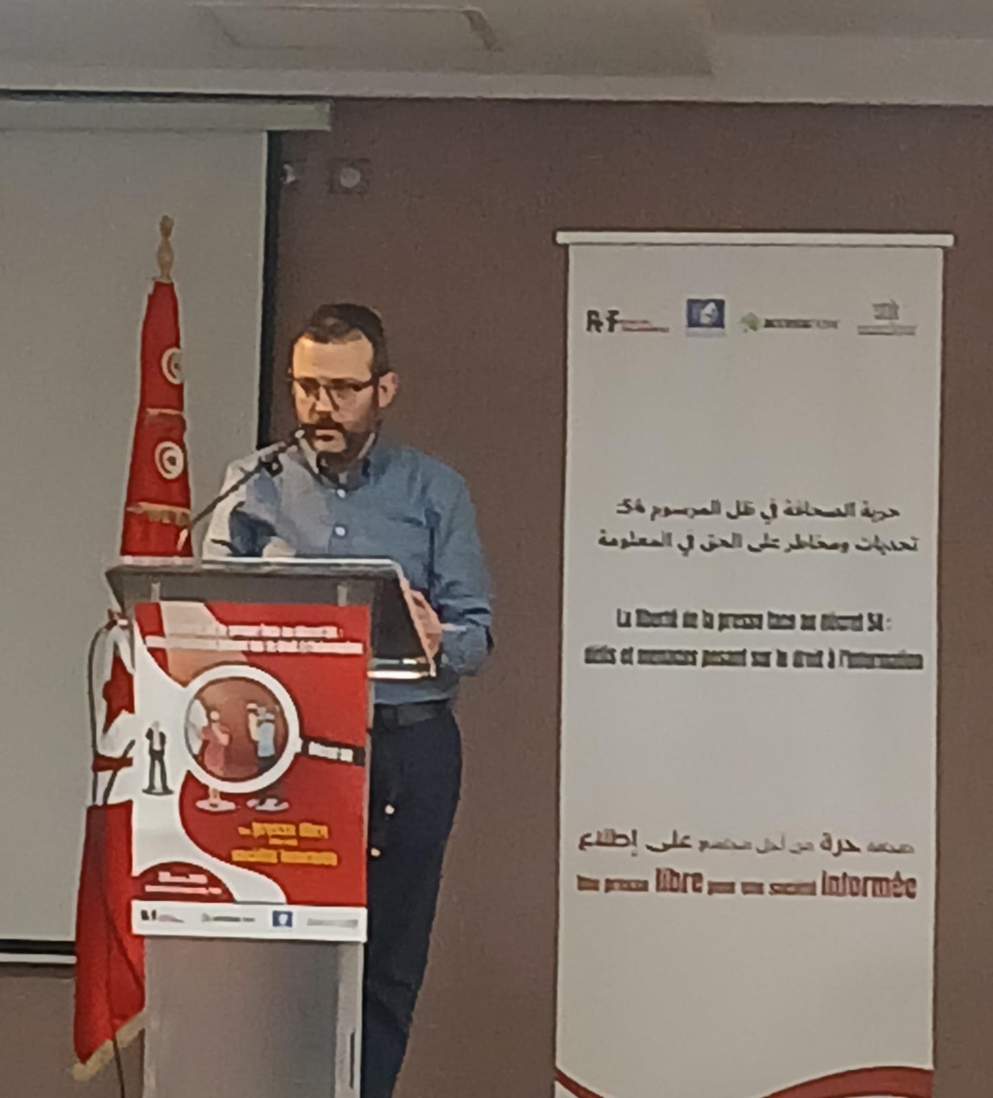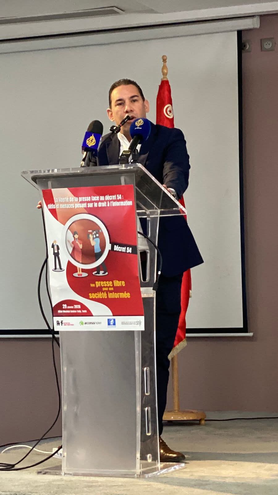 ​خلال الجلسة الافتتاحية، استعرض نقيب الصحفيين، زياد دبّار، قراءة النقابة للمرسوم عدد 54، مشيراً إلى أن التطبيق العملي للنص تجاوز مكافحة الجرائم السيبرانية ليمسّ قضايا الرأي والتعبير. وأوضح دبّار أن التتبعات القضائية لم تعد تقتصر على المهنيين، بل شملت مواطنين على خلفية تدوينات أو آراء نقدية، مؤكداً أن النقابة تعمل مع شركائها لتوفير الإسناد القانوني اللازم لكل من يواجه تتبعات قضائية بناءً على هذا المرسوم.