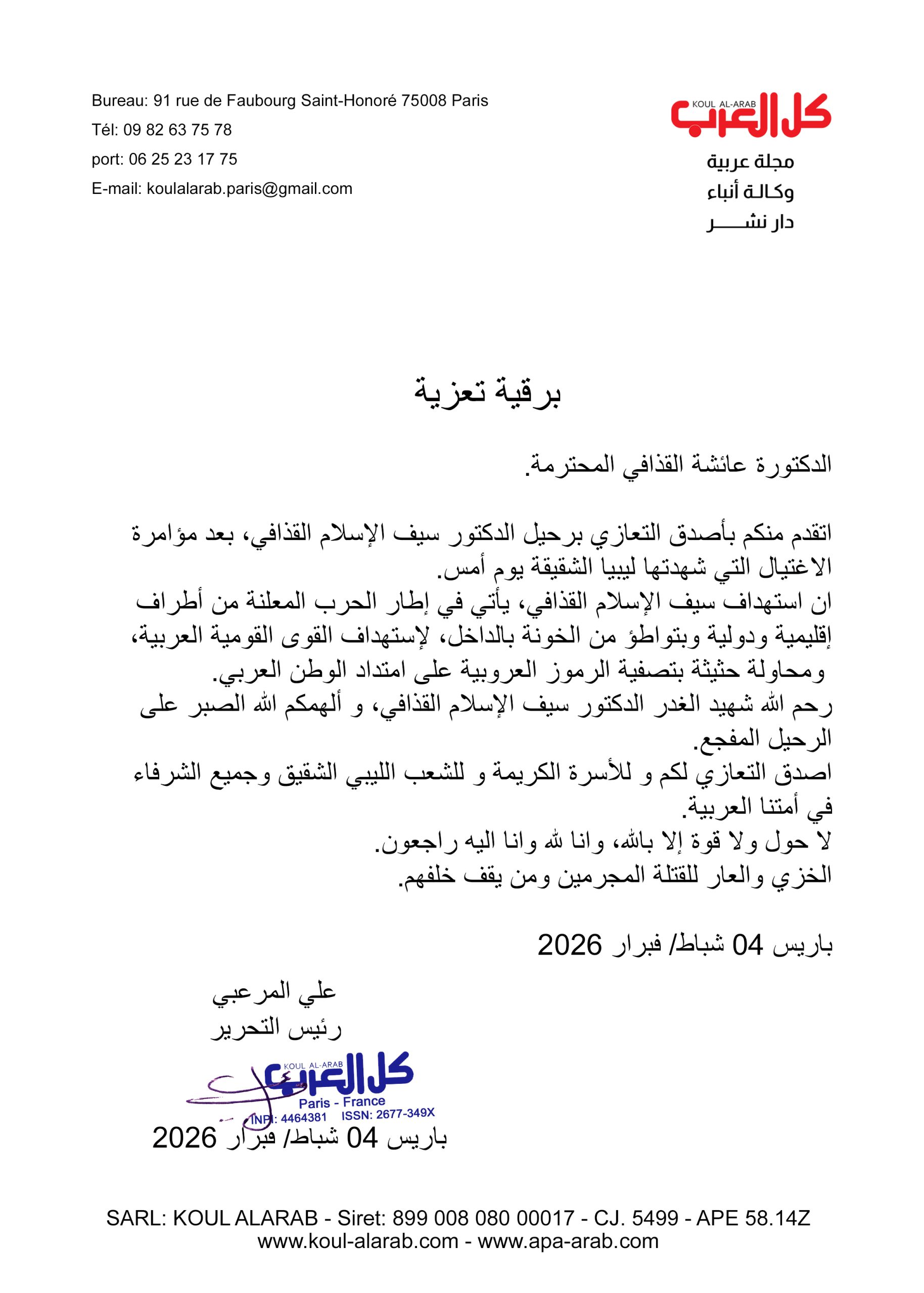 برقية تعزية بعد اغتيال سيف الإسلام القذافي