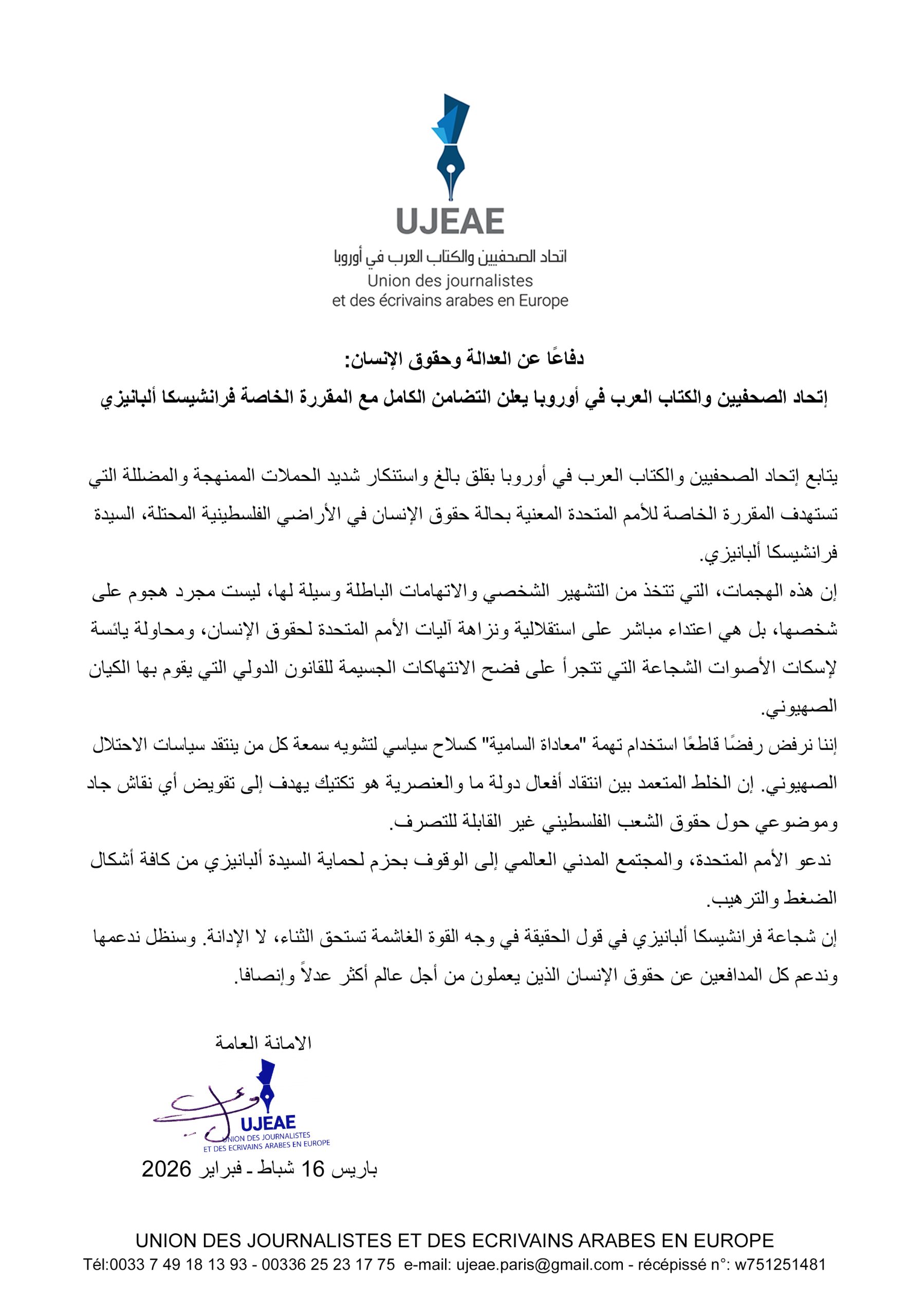 أصدر إتحاد الصحفيين والكتاب العرب في أوروبا بيانا للتضامن مع السيدة فرانشيسكا ألبانيزي