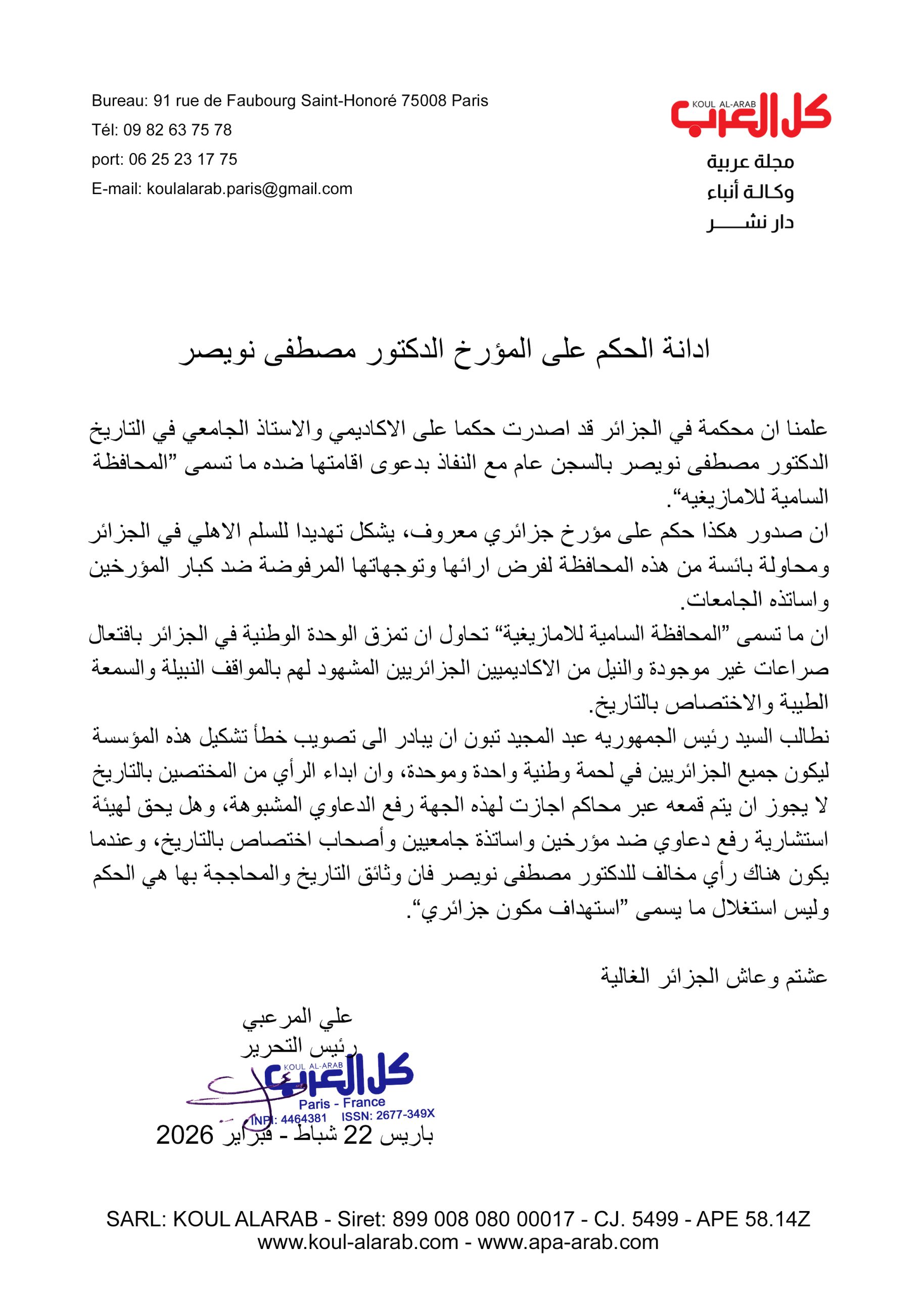 نطالب السيد رئيس الجمهوريه عبد المجيد تبون ان يبادر الى تصويب خطأ تشكيل هذه المؤسسة ليكون جميع الجزائريين في لحمة وطنية واحدة وموحدة، وان ابداء الرأي من المختصين بالتاريخ لا يجوز ان يتم قمعه عبر محاكم اجازت لهذه الجهة رفع الدعاوي المشبوهة، وهل يحق لهيئة استشارية رفع دعاوي ضد مؤرخين واساتذة جامعيين وأصحاب اختصاص بالتاريخ، وعندما يكون هناك رأي مخالف للدكتور مصطفى نويصر فان وثائق التاريخ والمحاججة بها هي الحكم وليس استغلال ما يسمى “استهداف مكون جزائري”.